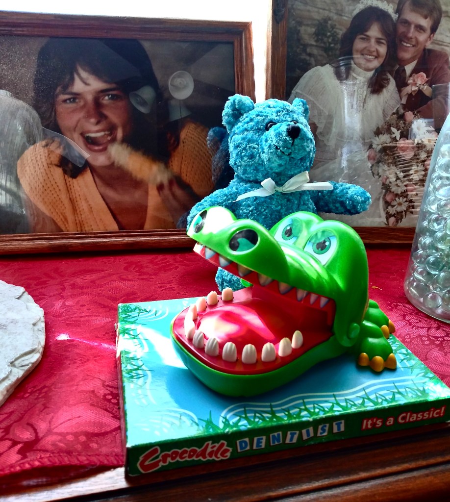 I think about it every time, and I visit home often. Today, on my drive down, I imagined my fingers searching over the plastic teeth, hoping that this turn wouldn’t be the turn. And I started writing this post in my head, and when I walked into the living room the actual crocodile, the one in this photo, was sitting atop a bookshelf.