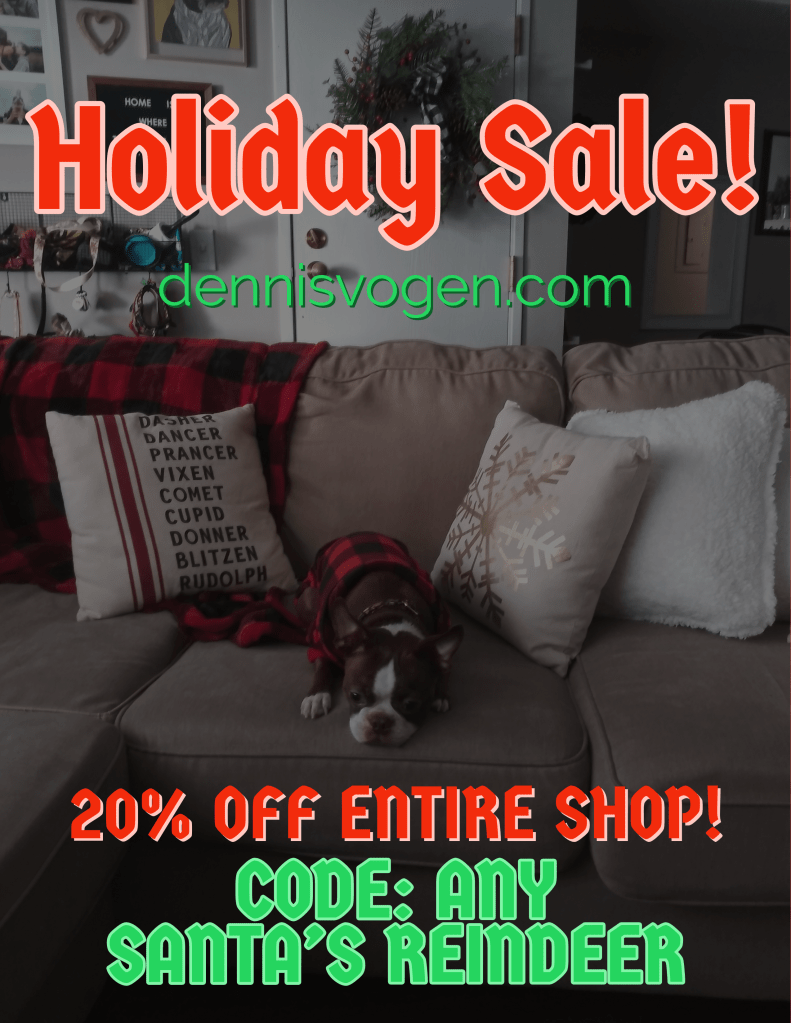 If you enter any one of Santa’s reindeers, in all caps, as a coupon code in my online store at dennisvogen.com, you will automatically receive 20% off your entire purchase. The whole bag. Your full cart.