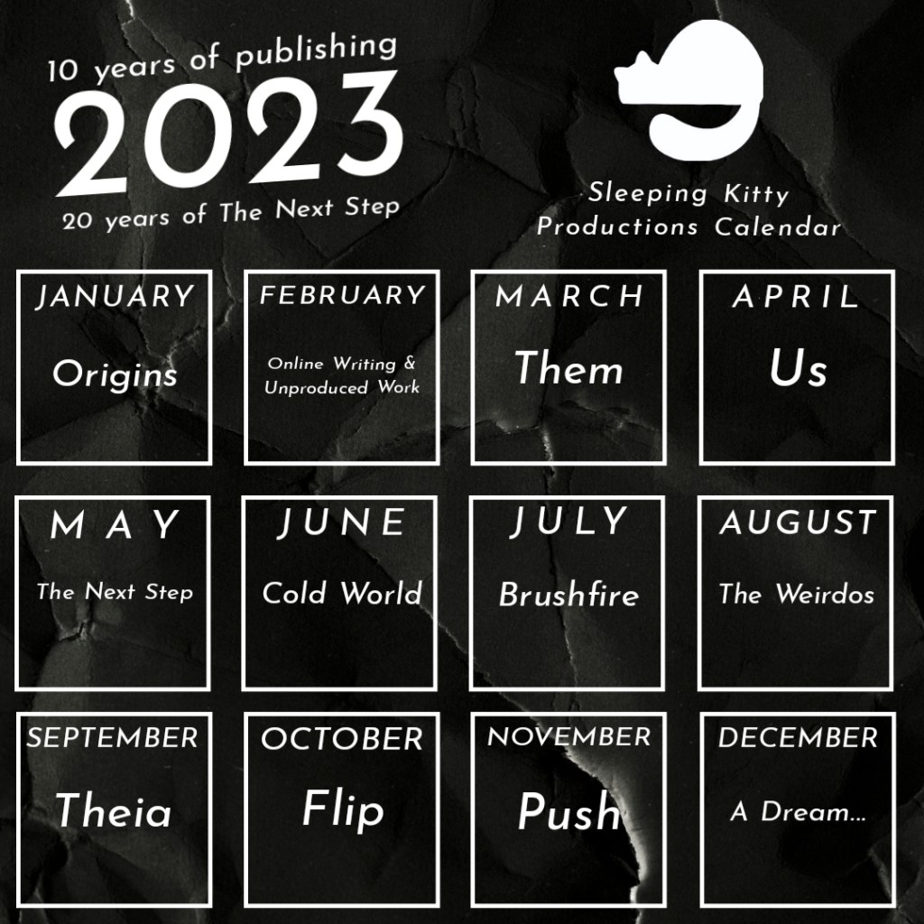 It’s pretty self-explanatory: each of my fiction books has a month dedicated to it, as does my music, with The Next Step featured in May. The first two months are more general: Origins explores where I came from, and Online Writing & Unproduced Work looks at my internet work and the stuff I never released, of which there is a fair and fun amount.