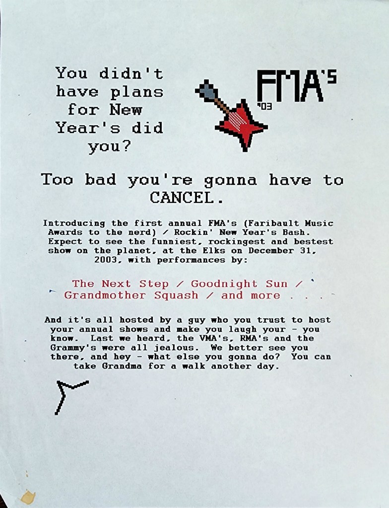 Going through this old material, I found something I should probably mention: I tried putting on something called the Faribault Music Awards on December 31st, 2003, which was, easily, one of the most embarrassing missteps of my early career.