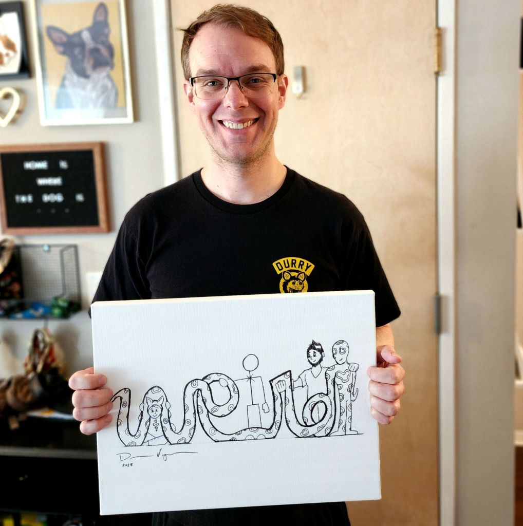 • An original piece: “weird,” 12 x 16, blue pencil & Sharpie on canvas, signed by artist, 2025